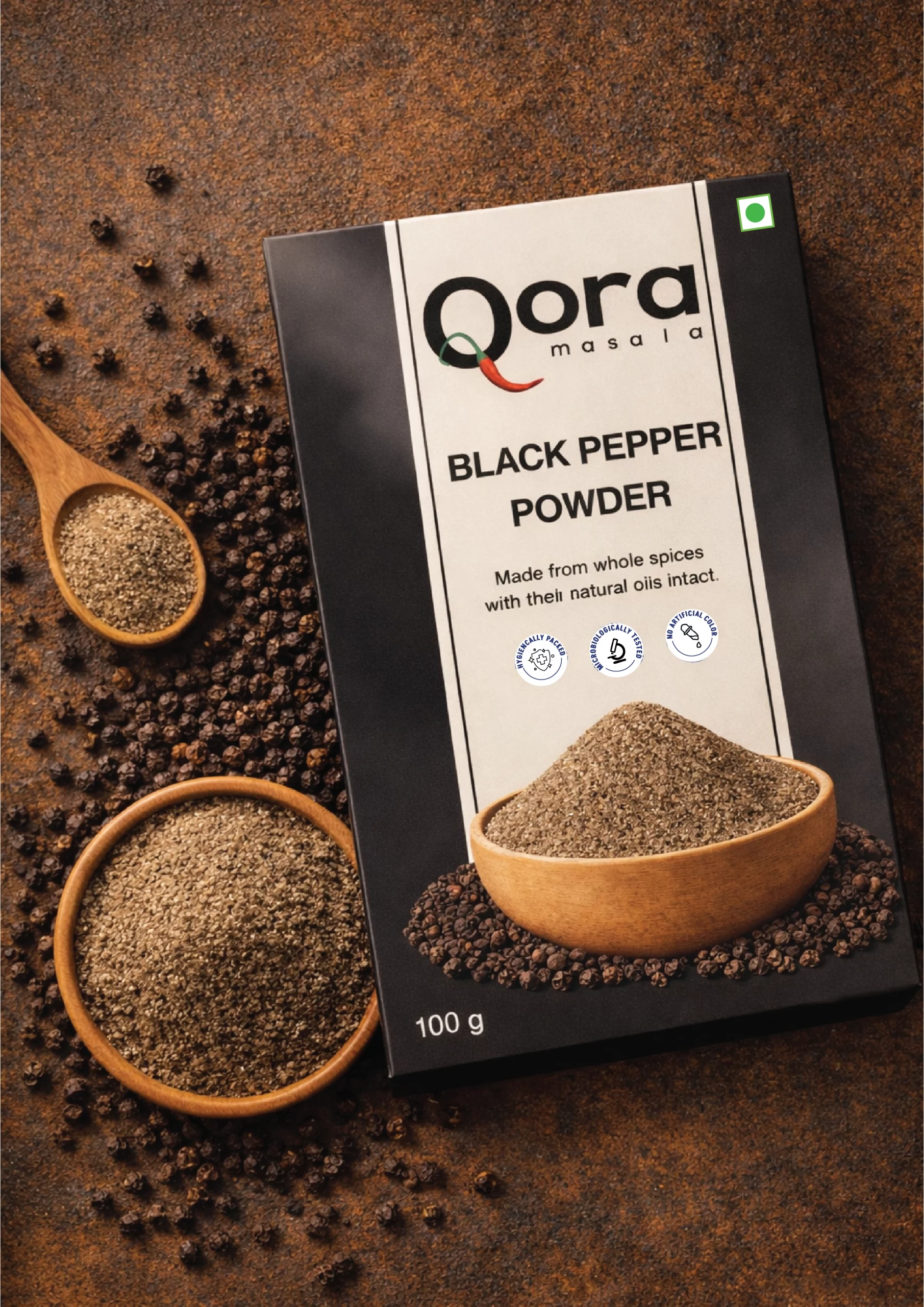 Qora’s Black Pepper Powder is finely ground from bold peppercorns cultivated in the monsoon-rich forests of Kerala. Known for their high essential-oil content and sharp, woody aroma, these pepper berries deliver warmth and clean heat to elevate any savoury dish.