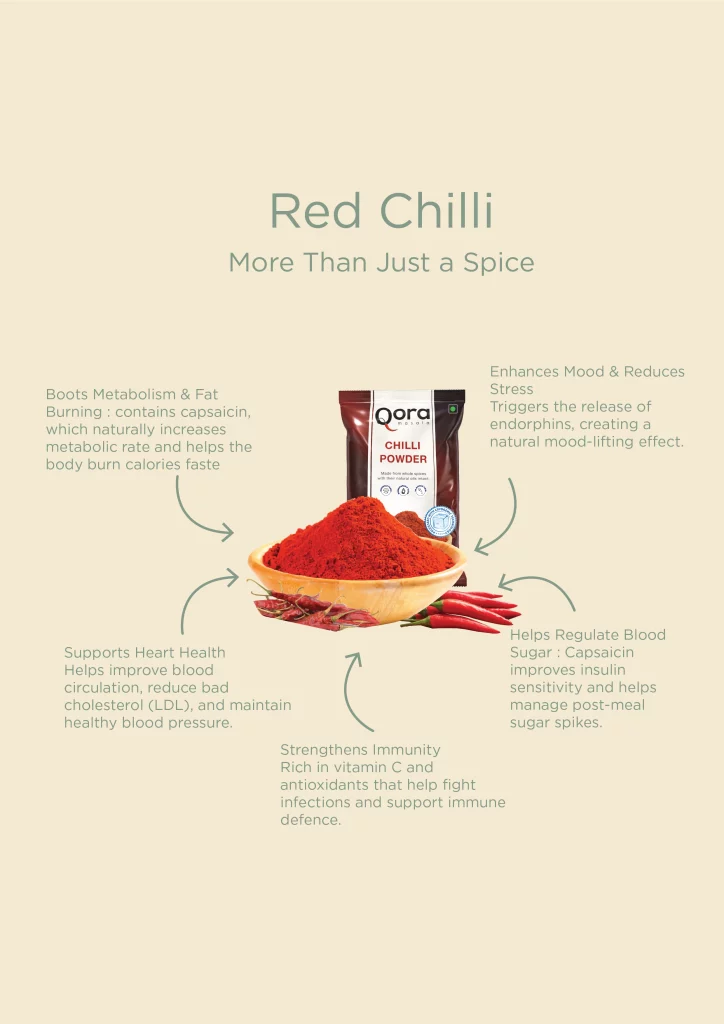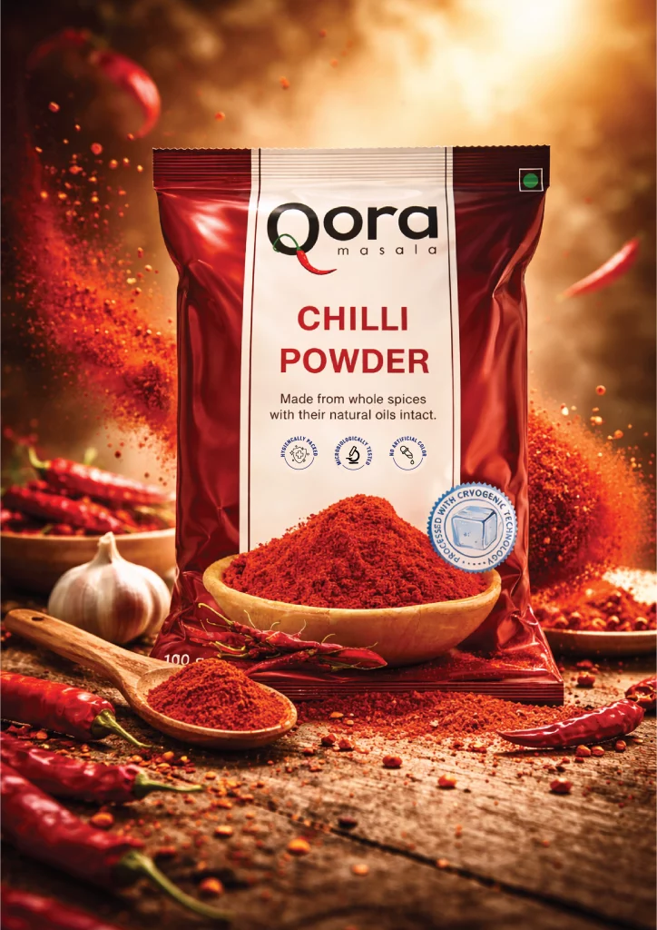 Qora’s Red chilli Powder is crafted from carefully selected sun-dried chillies known for their bright colour and balanced heat. Sourced from India’s leading chilli belts, each batch carries a clean, vibrant flavour without bitterness. Finely ground using advanced technology, it delivers consistent colour, aroma and spice—perfect for global cuisines seeking authentic Indian character.
