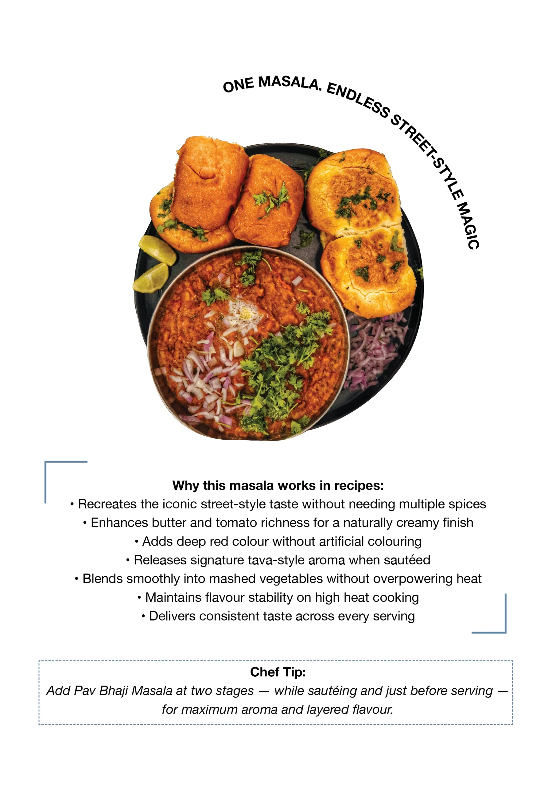 Perfect for pav bhaji, tawa mixes, vegetable gravies and street-style sautéed dishes.