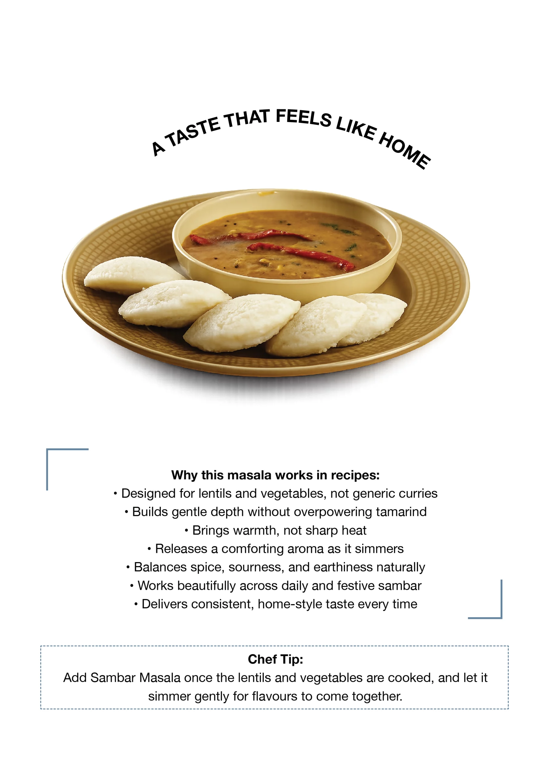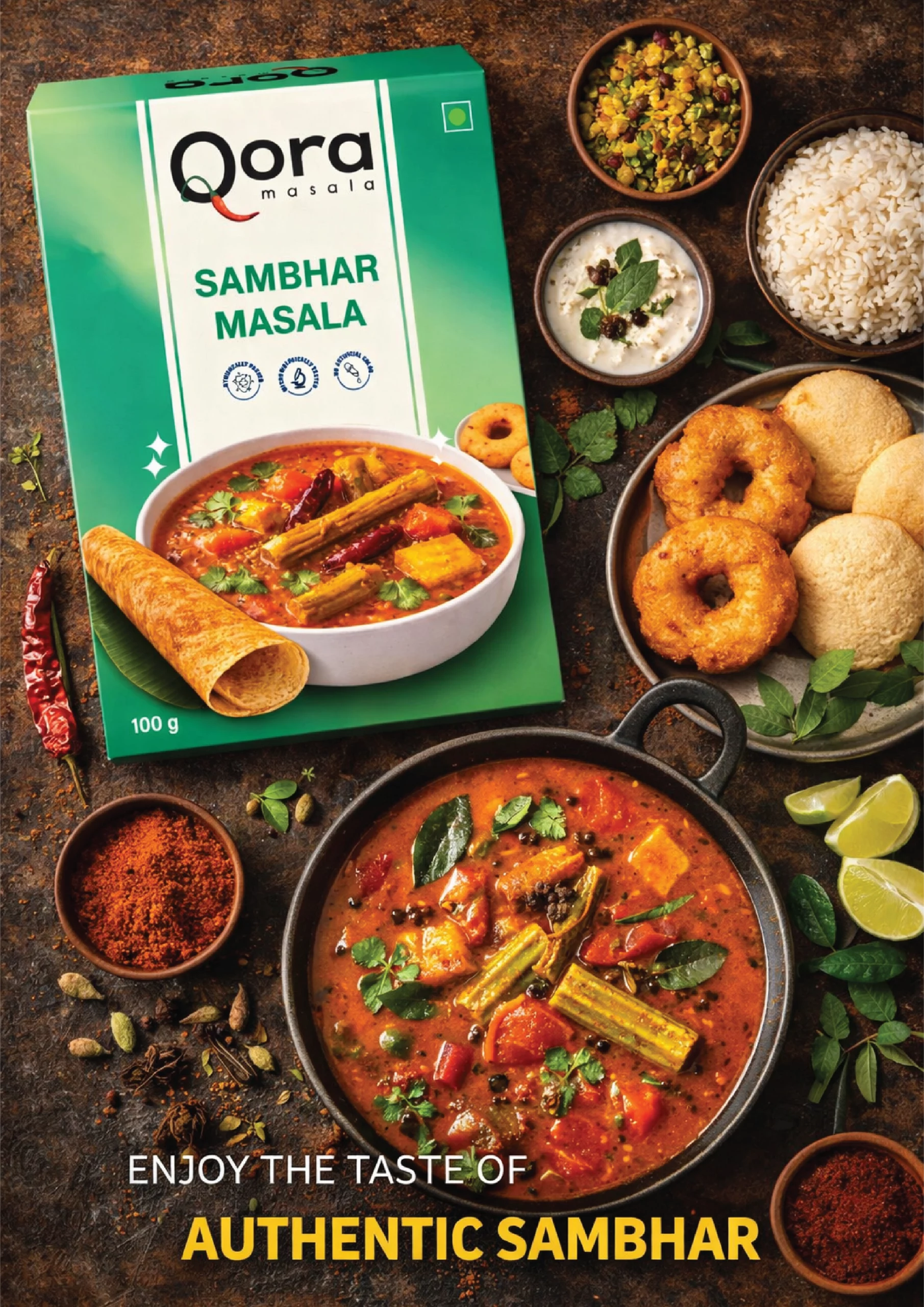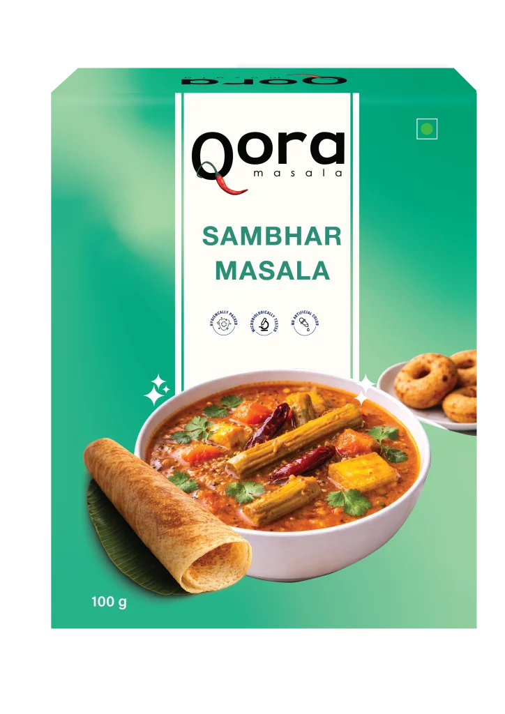 Qora’s Sambhar Masala is crafted from a traditional mix of lentils, red chillies, fenugreek, coriander and curry leaves. It delivers the perfect balance of heat, tang and aroma that defines an authentic South Indian sambhar.